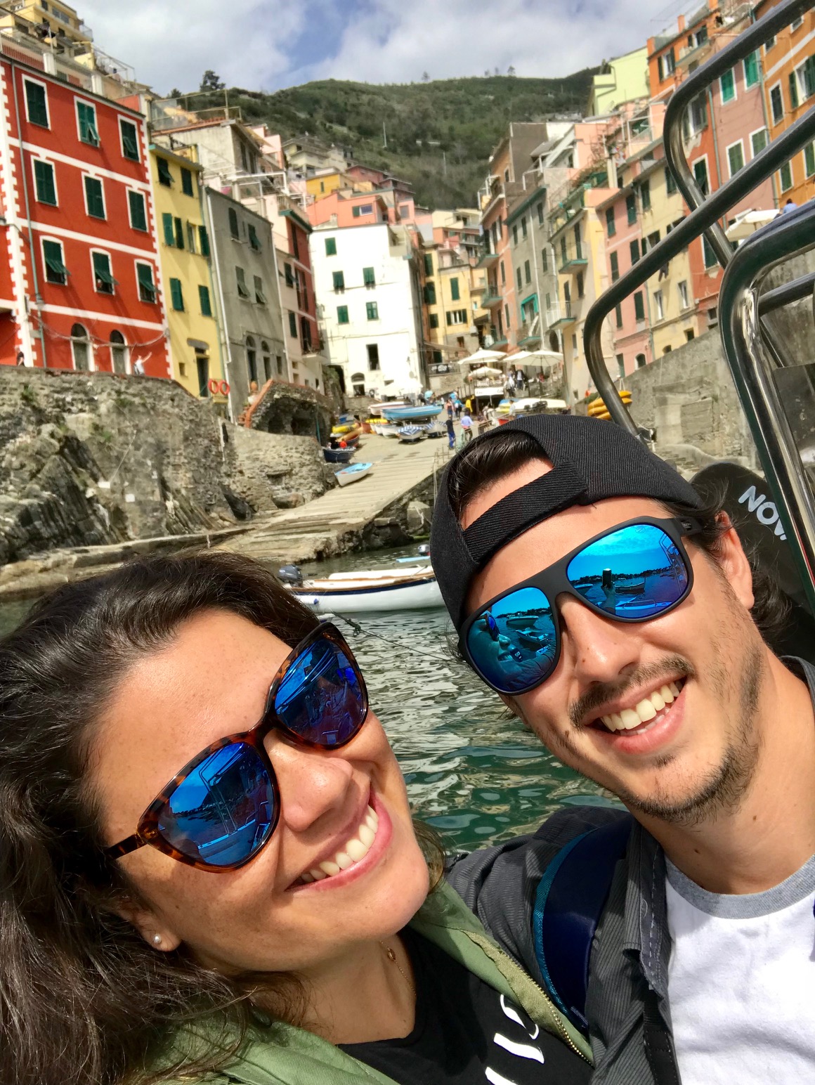 Llegamos a Vernazza en tren, que es el tercer pueblo. Tan sólo llegar ahí te deja maravillado, caminar a la costa y ver el mar tranquilo mientras puedes sentarte a disfrutar del paisaje en la playa (chica pero se puede, de hecho vimos a muchos con sus mantitas relajándose), o en las mesas de los restaurantes que hay por ahí. Caminamos un rato conociendo el lugar, y no nos aguantamos: contratamos un tour en bote. Por 60 euros para 6 personas, nos llevaron a dar una vuelta recorriendo los pueblos que nos habíamos saltado, y terminamos el viaje en Monterosso, el primer pueblo. El capitán del bote, con suma paciencia nos dejó tomar fotos tranquilos y hacer videos con el drone, y hasta nos dio tiempo para comprar pizzas antes de subirnos al bote. Creo que todo esto fue la mejor parte del paseo: felicidad.