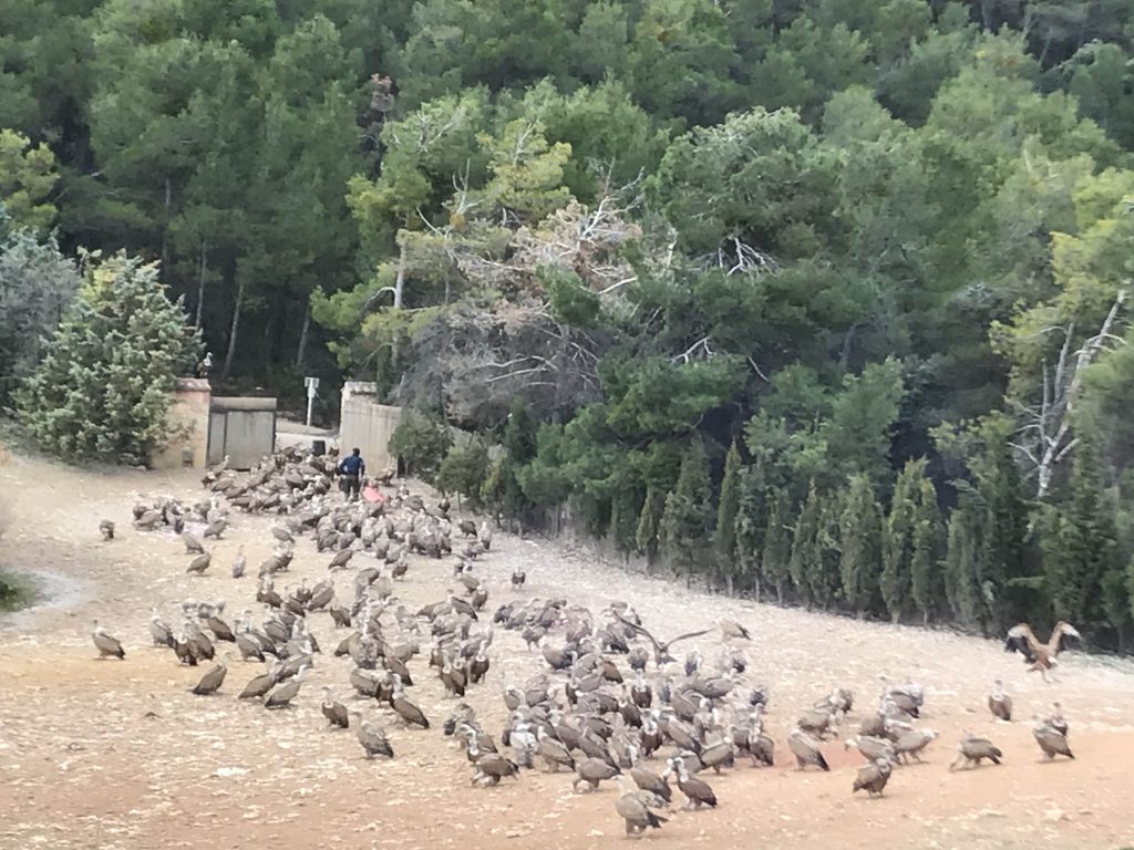 Una vez ahí, se instalaran a dentro de una casita con vista panorámica. Detrás de un ventanal y con altavoces reproduciendo todo lo que ocurre a fuera, verán como José Ramón lleva carretillas de comida (llenas con restos de los mataderos) y como de repente llegan 100, 200… ¡hasta 300 buitres desde arriba de las cimas para comer! Para lograr este resultado, José Ramón tardó más de 2 décadas. Eso es lo impresionante. Venía cada día a dejarles comida en el mismo lugar. Después de algunos años, los buitres toleraron que él estuviese presente mientras almorzaban. Ahora, con solo verlo, ya llegan y se intalan esperando a que les sirvan la comida. Si él no estuviera, o si viniese otro, los buitres no bajarían. Si están comiendo y escuchan un ruido, huyen volando. Su boliche ya se hizo famoso entre los rapaces. Los más expertos, podrán detectar que algunos buitres vienen desde los pirineos e incluso, algunas veces llegan desde el norte de África.
