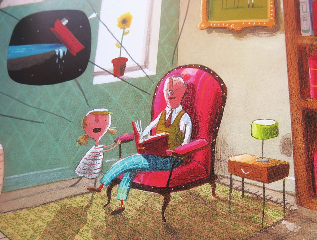 Dejándonos de teorías, algo así pasa en El corazón y la botella de Oliver Jeffers. La protagonista es una niña curiosa, con ganas de comerse el mundo. Un hombre la acompaña en ese camino y comparten el placer de descubrir. Hasta que, nos cuenta el libro, la niña descubre un sillón vacío.